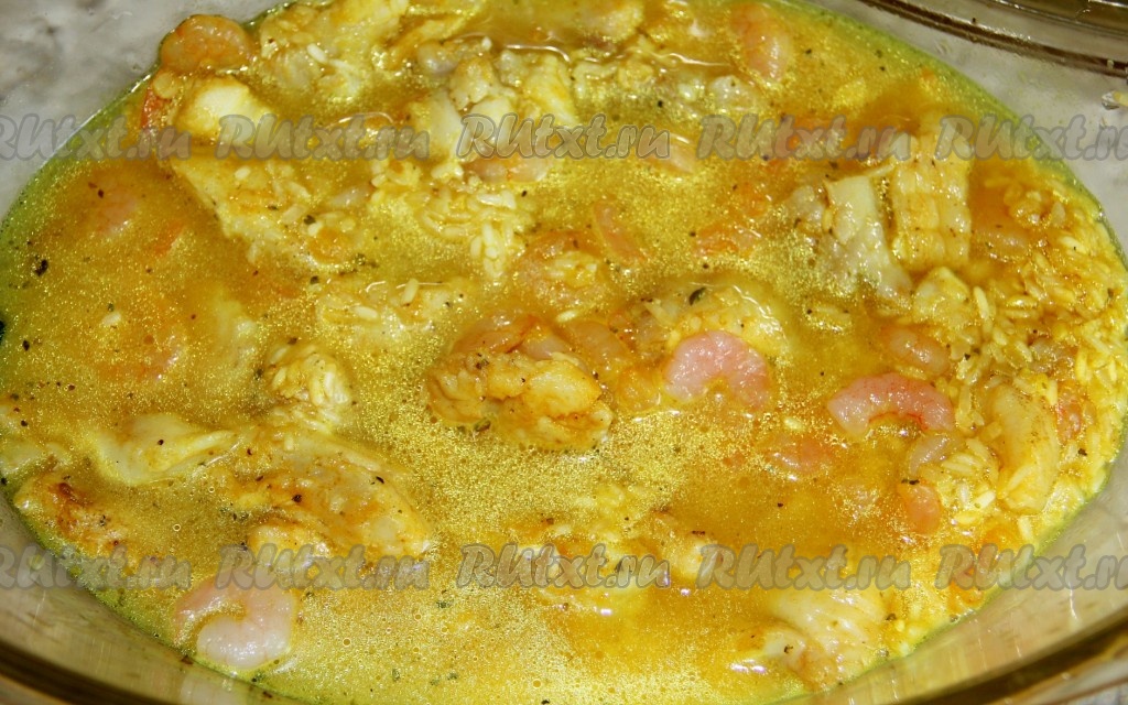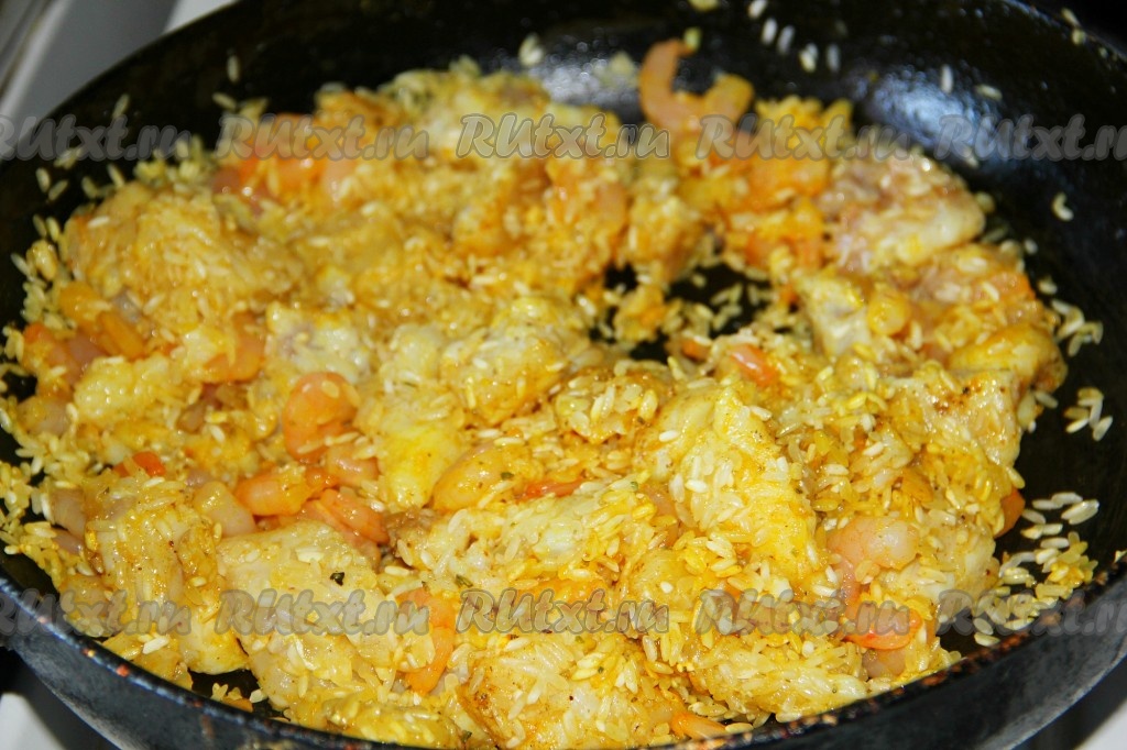 Рис с морепродуктами залить 2 стаканами горячей воды, накрыть сковороду крышкой, дать воде закипеть, а затем готовить на самом малом огне 20 минут. Вода должна полностью выкипеть, а рисинки стать мягкими, но при этом не разваренными.