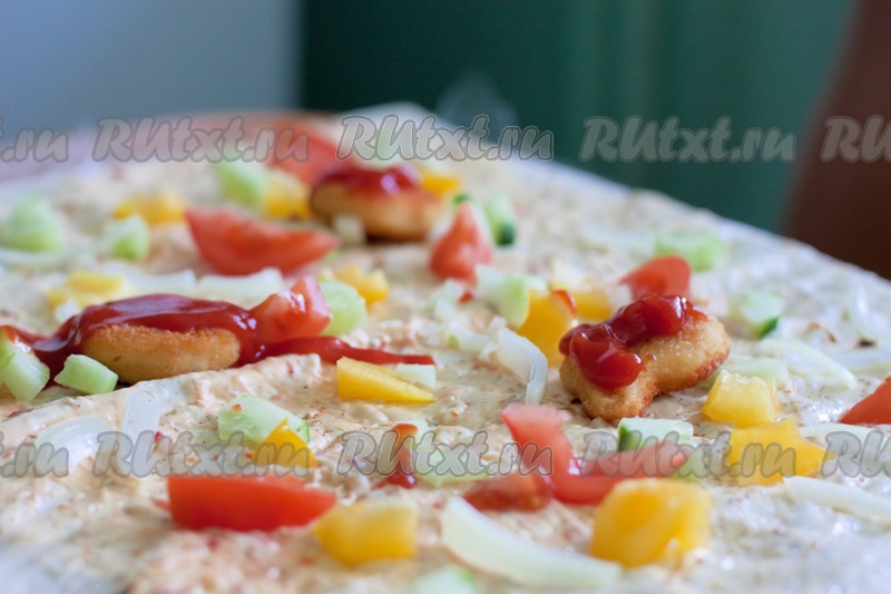 Разверните лаваш на столе (подстелив пищевую пленку) или кухонной доске. Смажьте его соусом и дайте немного пропитаться. Лаваш можно обрезать, если он слишком большой. Тем временем подготовьте продукты для начинки: наггетсы обжарьте с двух сторон до хрустящей корочки, огурцы, помидоры и перец нарежьте небольшими кубиками или полосками. Репчатый лук нарежьте полукольцами, а сыр - кубиками. Если используете листья салата, можно их порвать руками или добавлять целыми. Выложите подготовленные продукты на лаваш в произвольном порядке, при этом выдавив на наггетсы немного кетчупа. Слегка поперчите.