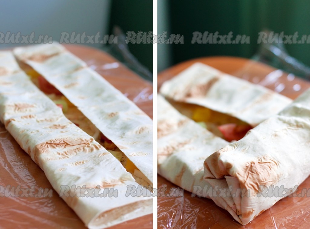 Начинайте сворачивать лаваш удобным для вас способом или как это делаю я, сначала завернув края почти до середины, затем свернув лаваш в рулет. Старайтесь сворачивать осторожно, так как лаваш имеет свойство рваться и начинка рискует вывалиться. Для удобства нижний край Чикен ролла можно обмотать пищевой пленкой или салфеткой (желательно кушать над тарелкой).