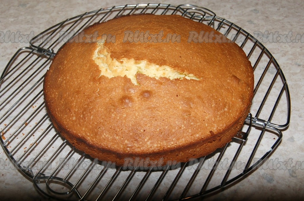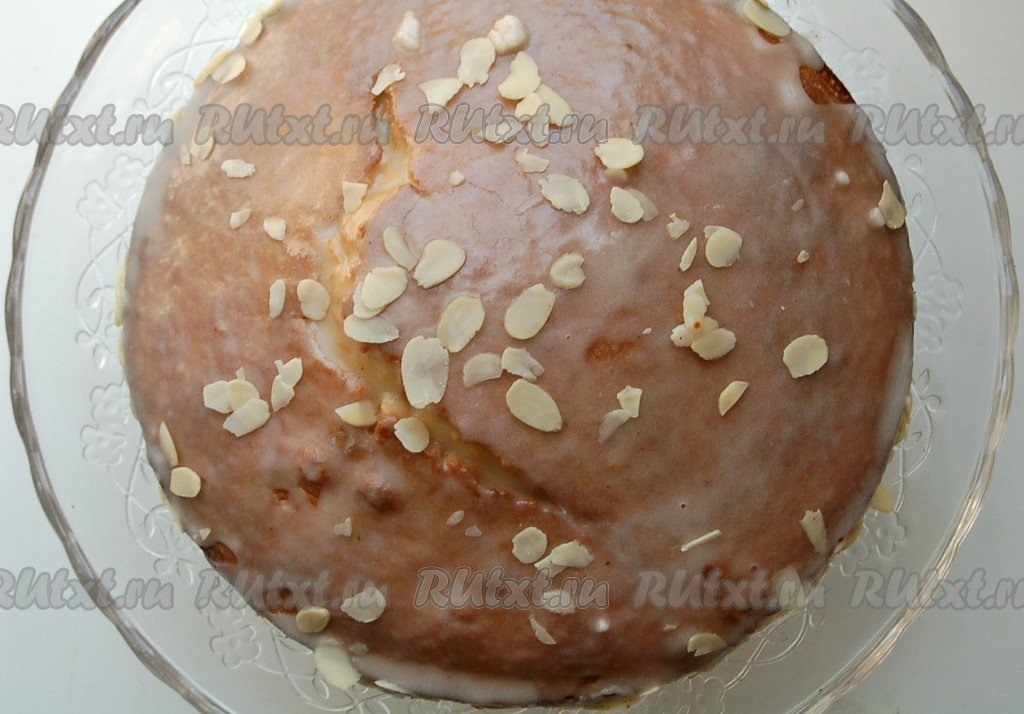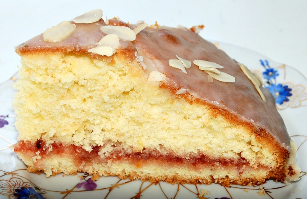 Второй корж кекса разместить на нижний корж, смазанный вареньем. Сверху залить сахарной глазурью, украсить миндальными лепестками или на свое усмотрение.