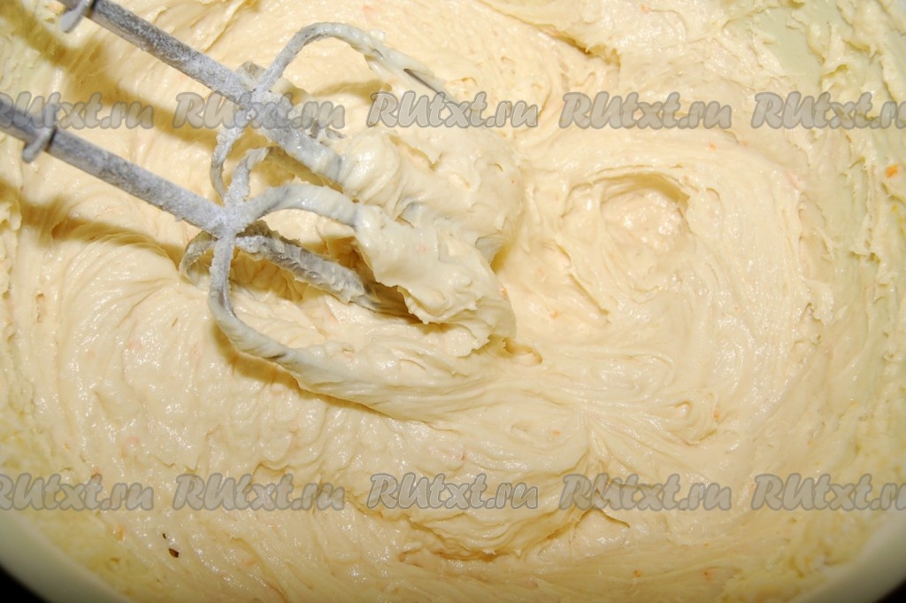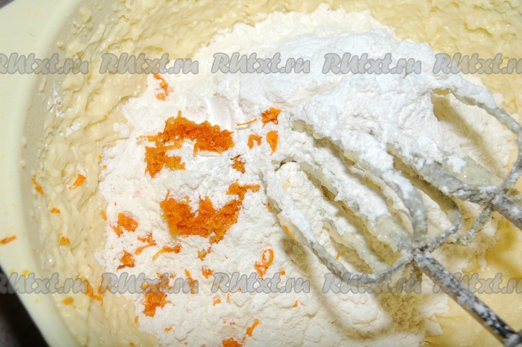 Муку просеять, смешать с кукурузным крахмалом и разрыхлителем муки. Цедру почистить (с помощью мелкой терки) с одного апельсина и добавить в массу.