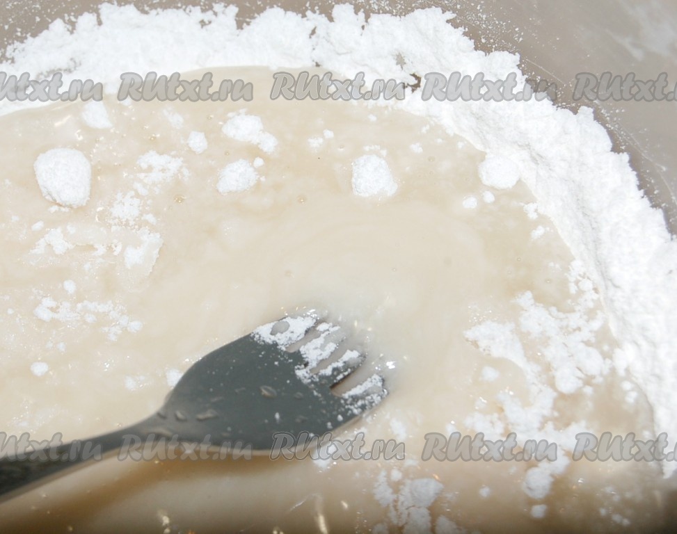 Приготовить глазурь. Для этого поместить в мисочку сахарную пудру, добавить апельсиновый сок (или воду) и взбить вилкой до гладкости.