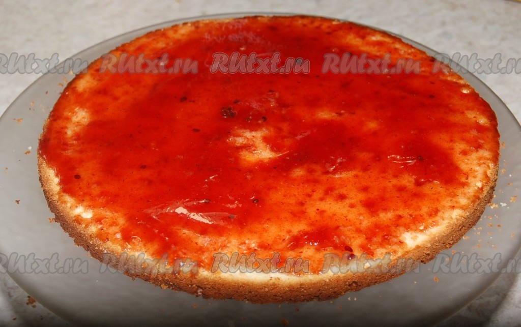 Нижний корж кекса смазать вареньем. Чтобы не попали ягоды и варенье стало более однородным по своему составу, варенье лучше процедить через сито.