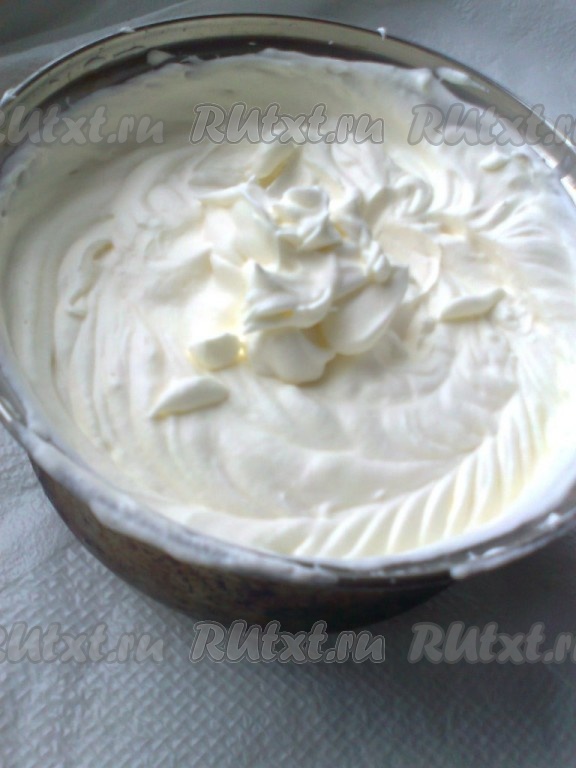 Бисквит пропитать любым фруктовым сиропом (или 100 мл воды, смешанной со 100 граммами сахара).