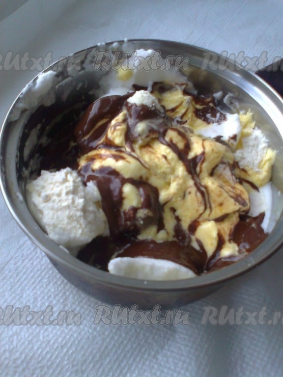 Муку просеять, соединить с разрыхлителем и ванильным сахаром. Соединить шоколадную массу, масляную массу, взбитые белки и муку, аккуратно перемешивая вручную.