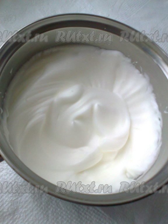 Отдельно взбить миксером белки с 130 граммами сахар до устойчивых пиков (взбивать минут 5). Перед взбиванием сухую посуду для взбивания и белки обязательно поставьте на 10-20 минут в холодильник, чтобы белки хорошо взбились.