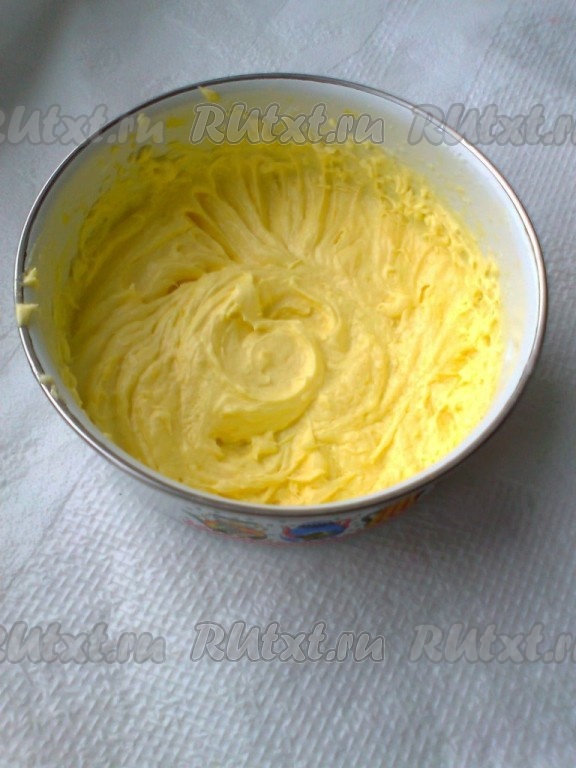 Приготовим шоколадный бисквит. Масло сливочное комнатной температуры взбить миксером с 30 граммами сахара, желтками и солью до однородной массы.