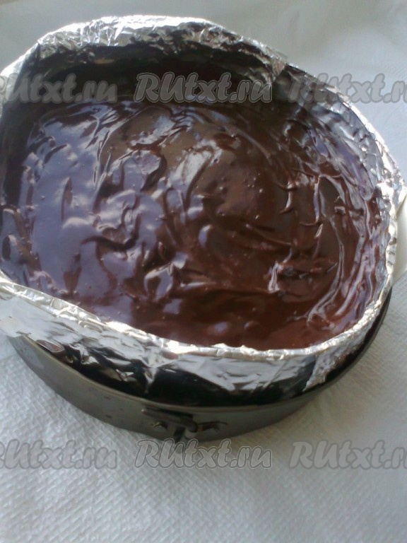 Форму изнутри прокладываем прозрачной плотной плёнкой (я вырезала бортики из коробки от конфет и обмотала фольгой от шоколадок) - выше бортиков формы не менее чем на 5-7 см. Выкладываем на бисквит сверху и в зазор между бисквитом и формой - чёрный шоколадный мусс, разравниваем и ставим в морозилку, пока готовим следующий мусс.