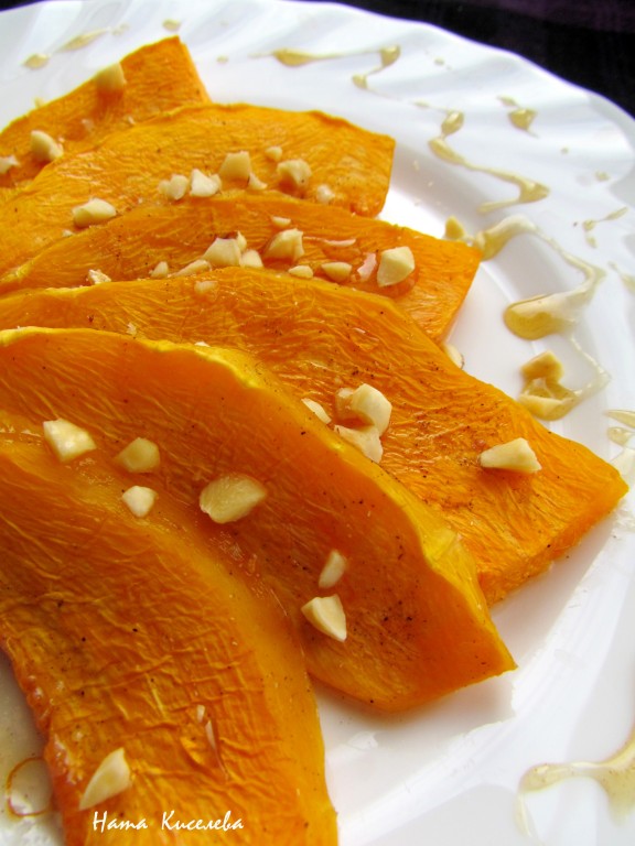 Противень с запечённой тыквой достаньте из духовки, дайте немного остыть, переложите на блюдо, полейте оставшимся мёдом, смешанным с корицей. Я ещё решила посыпать тыкву измельчённым фундуком. Просто, ароматно и вкусно, попробуйте!