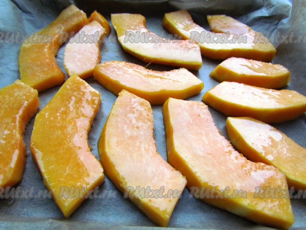Противень застелите пергаментом, выложите тыкву и запекайте в духовке до мягкости (около 15 минут) при температуре 190 градусов. Продолжительность запекания зависит от сорта тыквы.