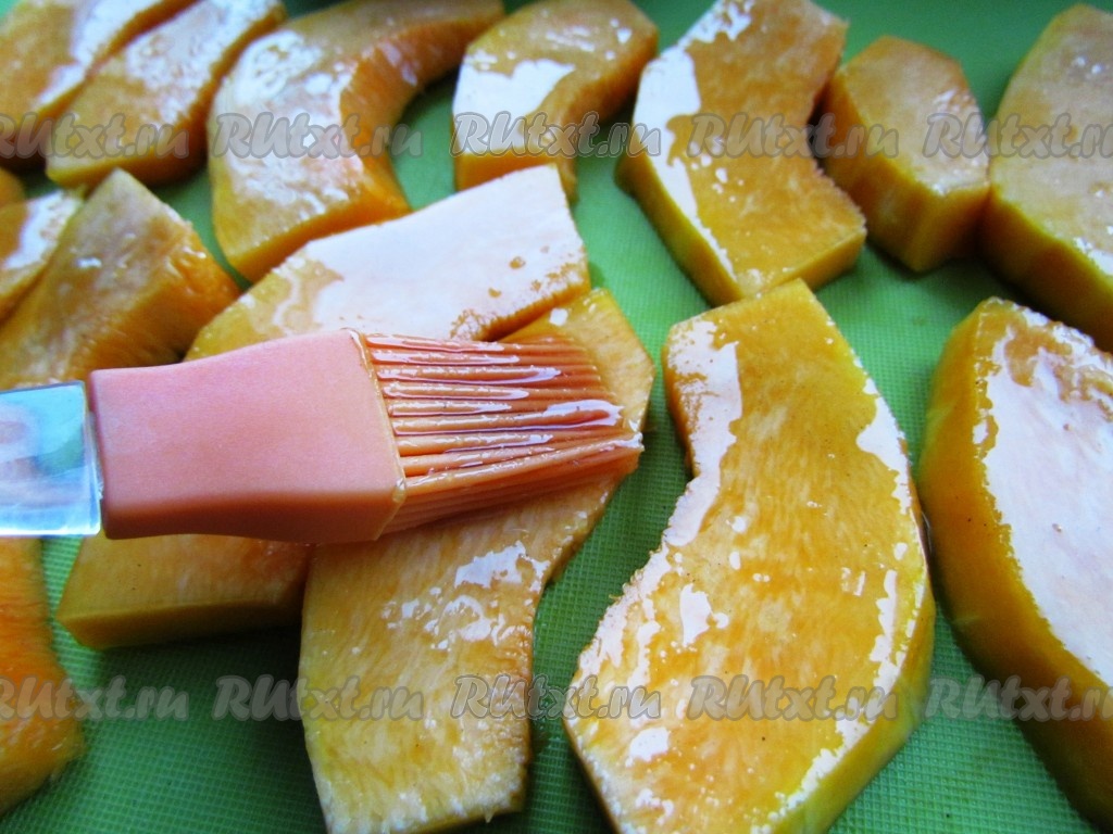 Смажьте каждый ломтик тыквы мёдом, смешанным с корицей.