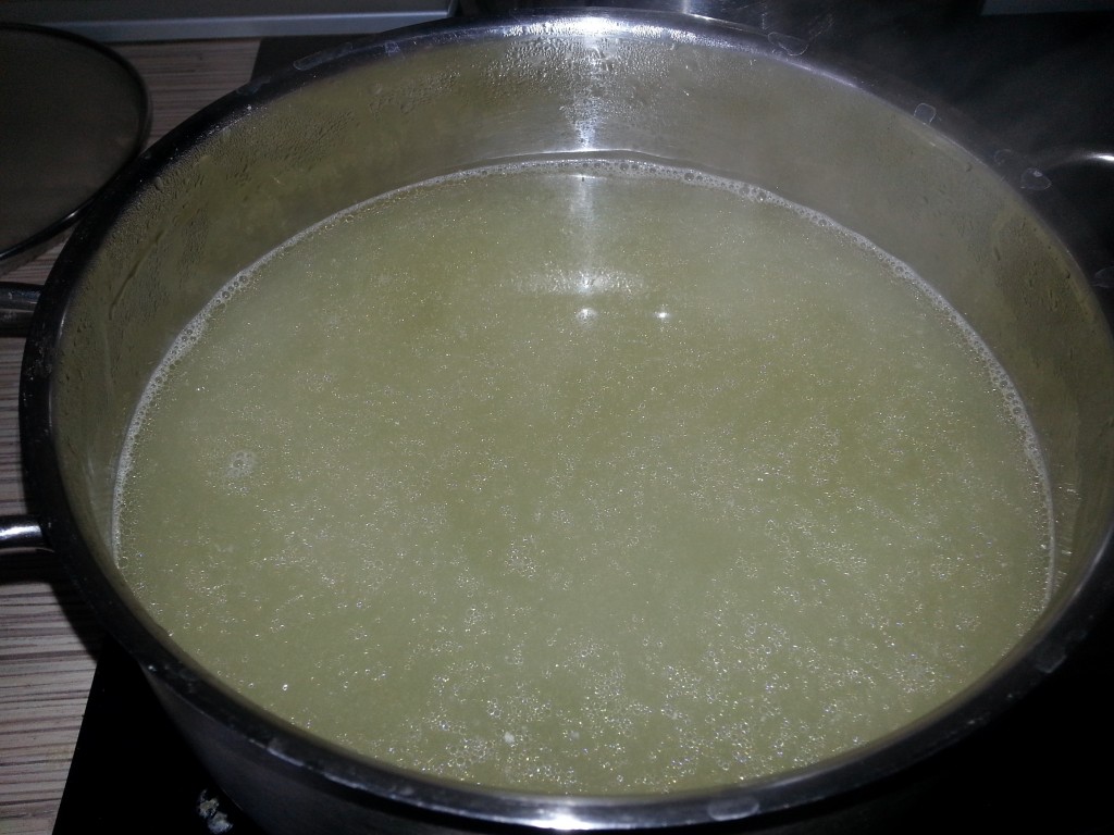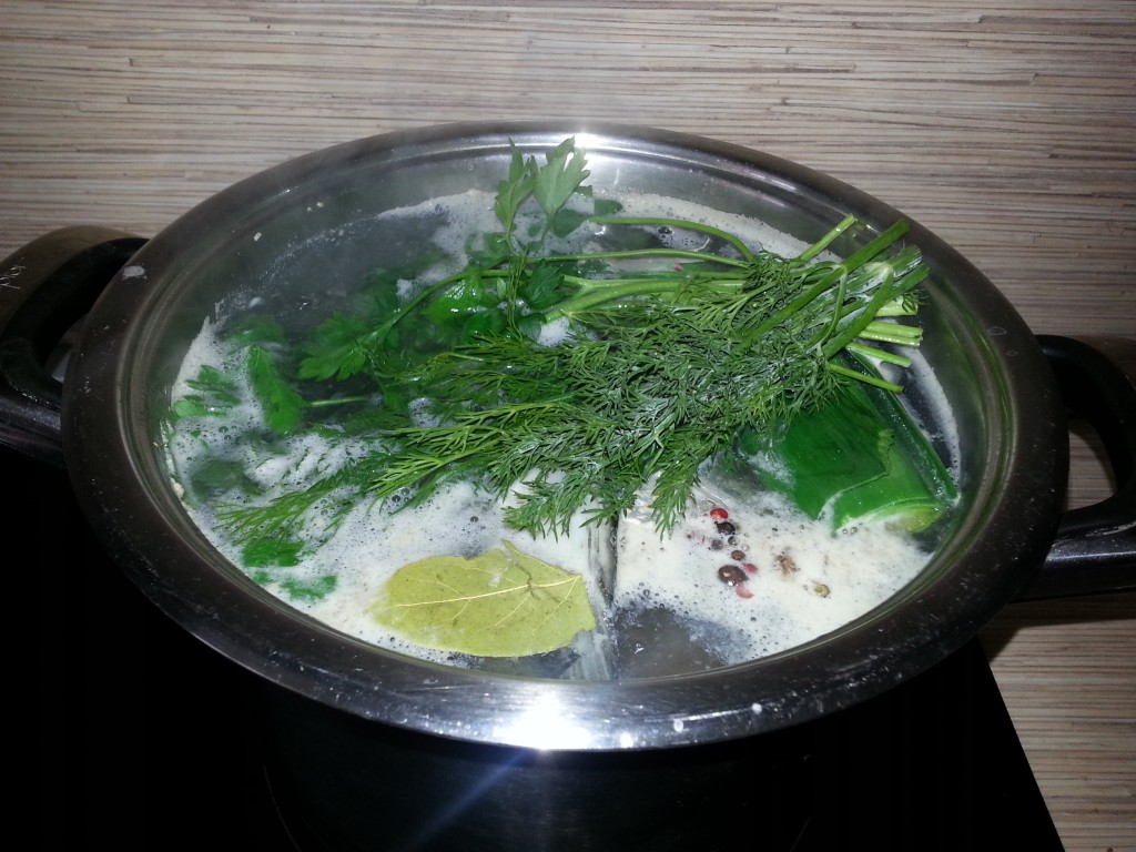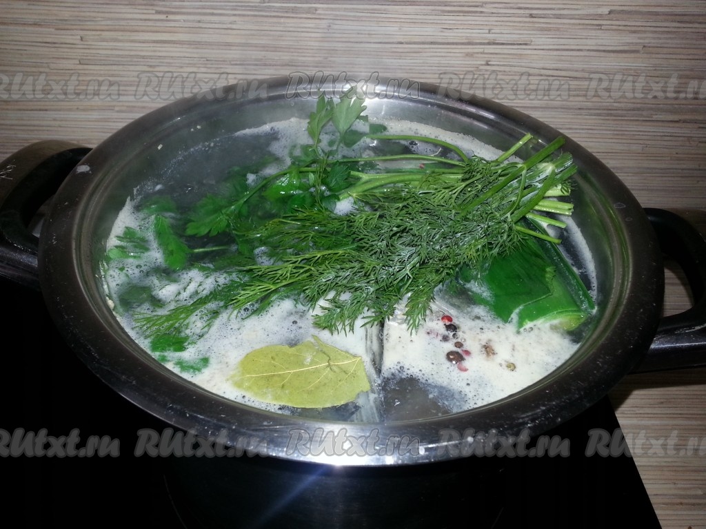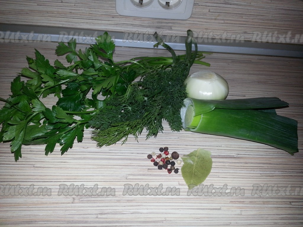 После того как вода закипит, снять пену, посолить и поместить в воду лук репчатый, лук порей, укроп, петрушку, смесь перцев, лавровый лист.