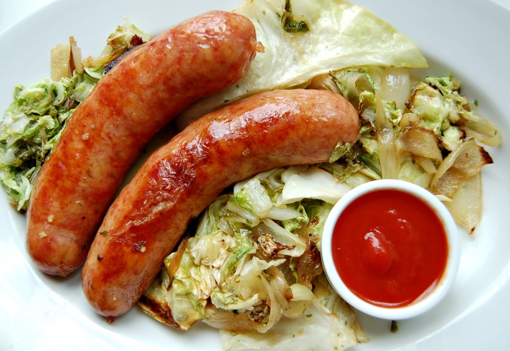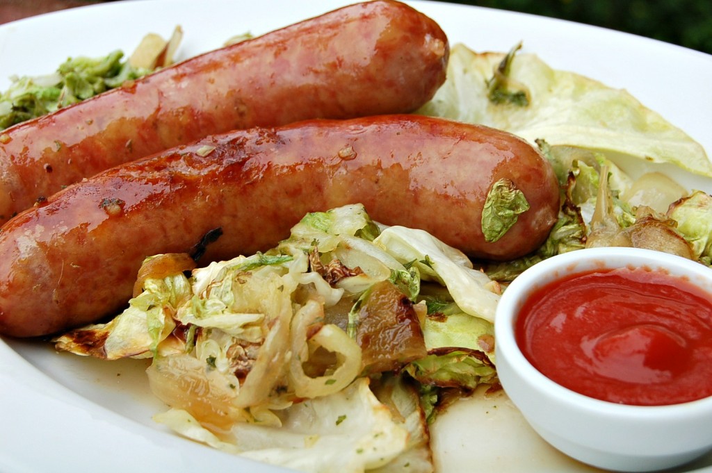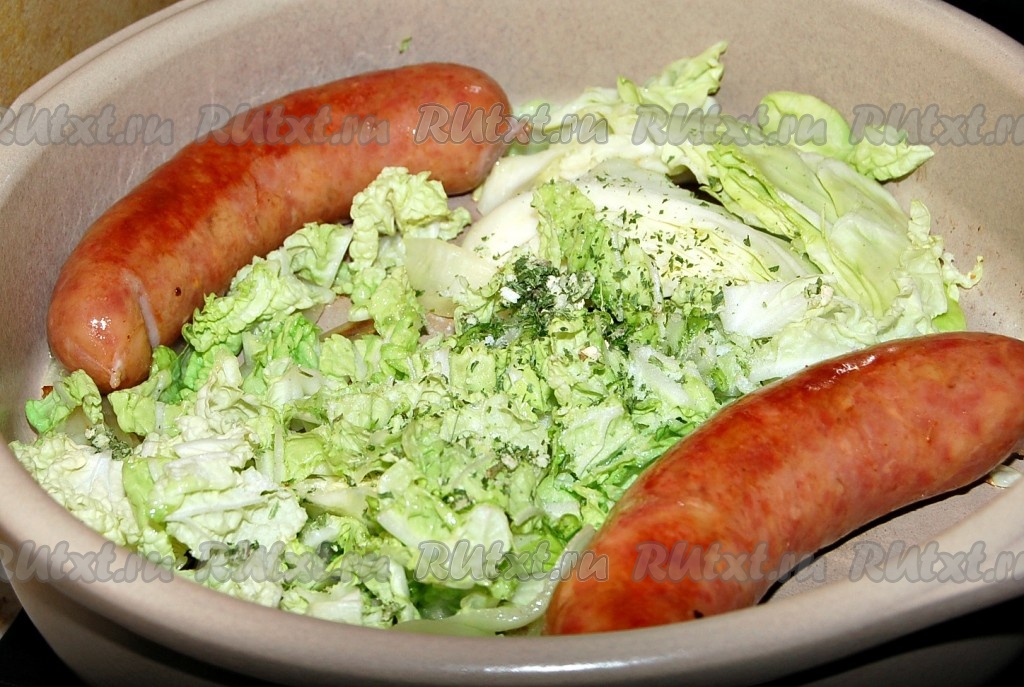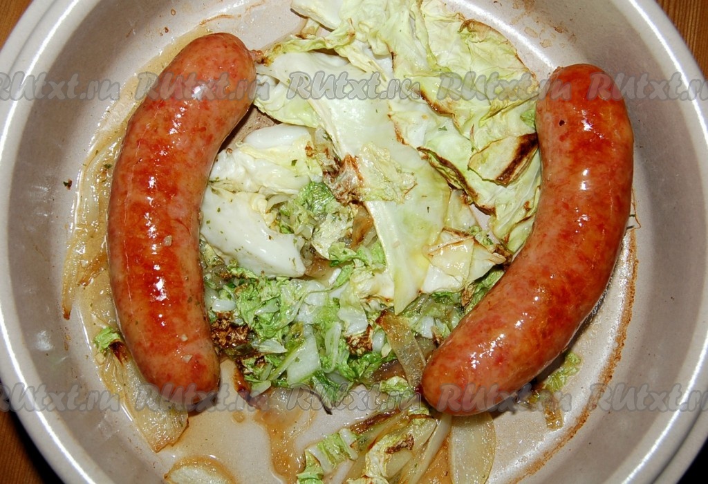 Жареные колбаски могут с большим успехом справиться с ролью главного блюда за обеденным столом. В качестве гарнира к жареным колбаскам могут быть использованы свежие или жареные овощи. Это может быть и смесь овощей, и какой-то один овощ. Я использовала в качестве гарнира свежую белокочанную и пекинскую капусту, так как капуста прекрасно сочетается с жареными колбасками. Можно сказать, что капуста и колбаски созданы друг для друга.