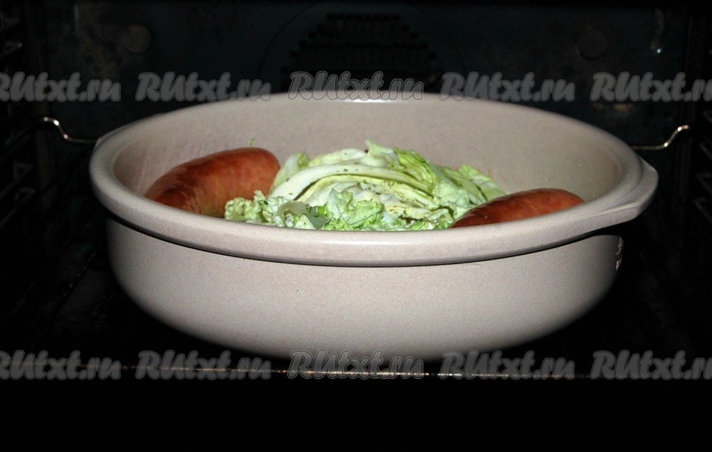 Перемешать и обжаривать 5 минут. Затем отправить сковороду (или форму) в заранее нагретую до 200 градусов духовку, чтобы колбаски полностью дошли до готовности.