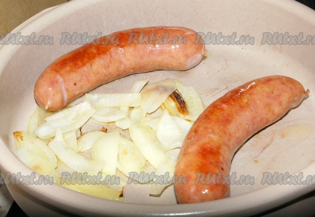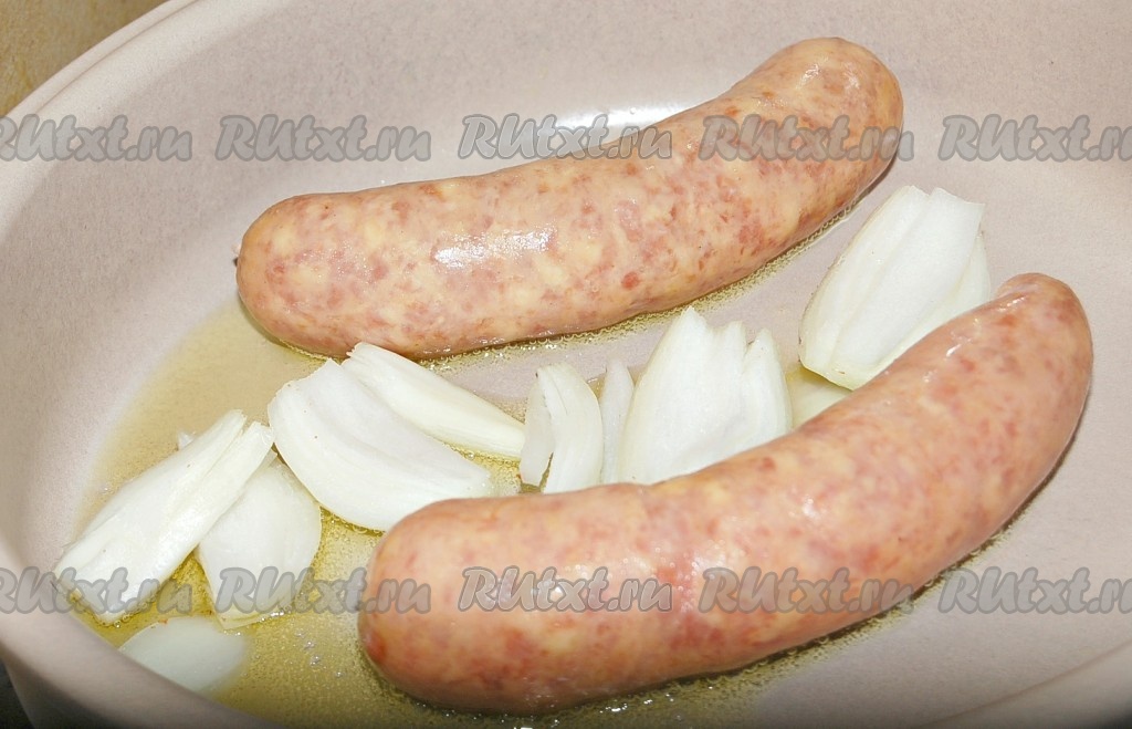 Обжаривать, периодически переворачивая лук и колбаски, до легкого подрумянивания.