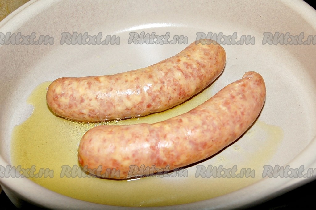 В сковороду (или огнеупорную форму) налить растительное масло и выложить колбаски.