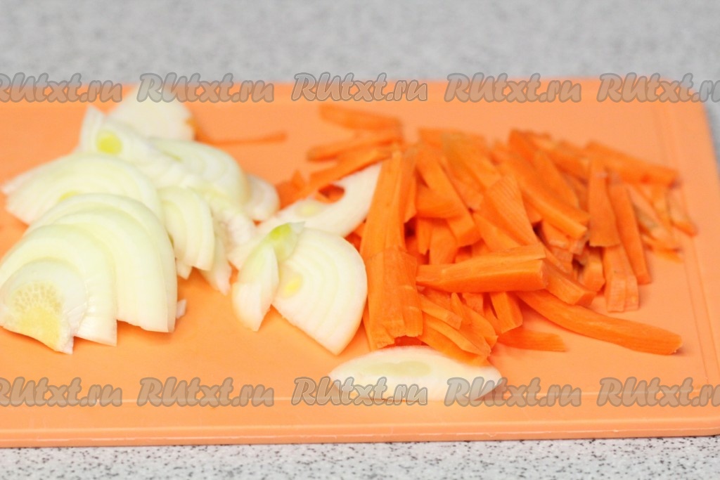 Нарезаем лук полукольцами, морковь - соломкой и обжариваем на растительном масле при открытой крышке на режиме "Выпечка" или "Жарка".