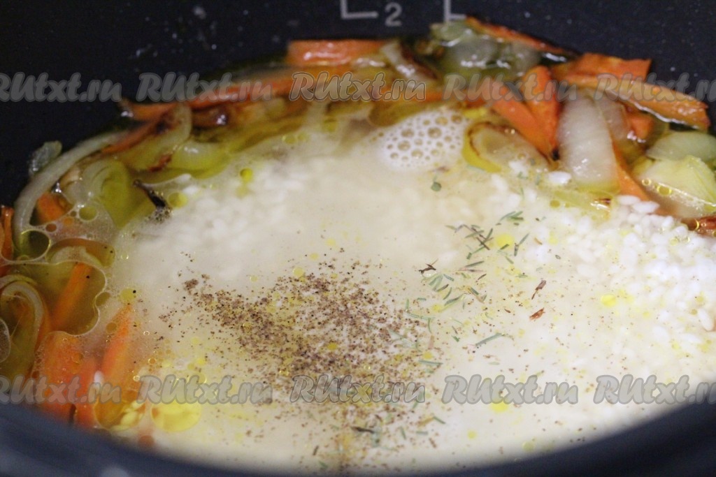 Выключаем жарку, когда овощи покроются румяной корочкой, и добавляем рис прямо с той водой, в которой он стоял. Посыпаем специями и солим по вкусу. Закрываем крышку и включаем в мультиварке режим "плов".
