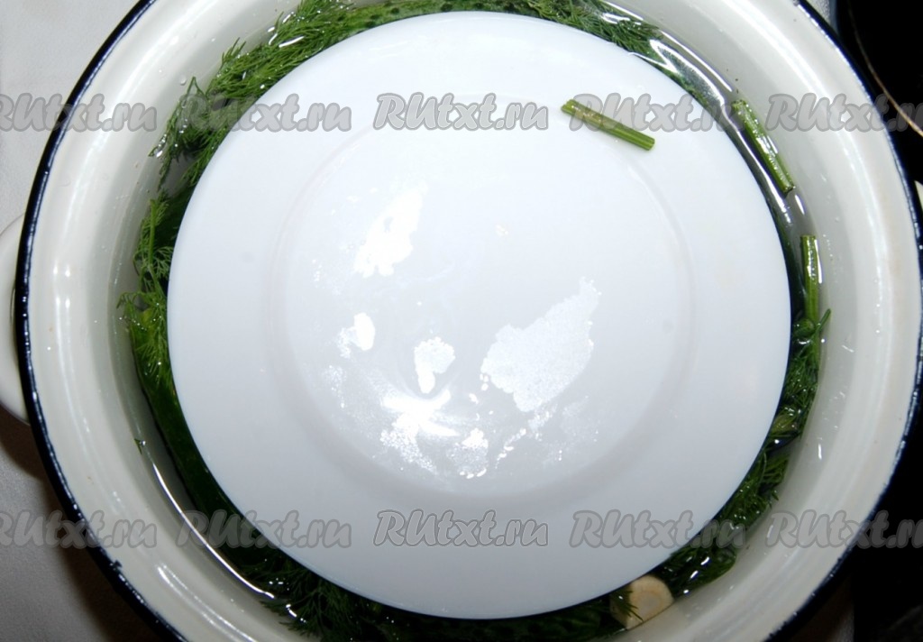 Взять кастрюлю (эмалированную или стеклянную), выложить дно укропом и разрезанными дольками чеснока.