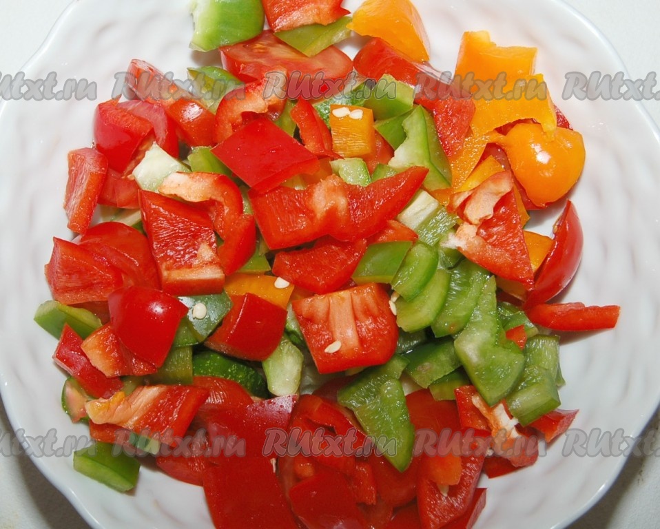 Болгарский перец нарезать некрупными кусочками и выложить в миску. Я использовала перец разных цветов.