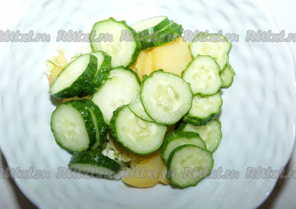 Картошку отварить, остудить и нарезать круглыми дольками, добавить в миску.