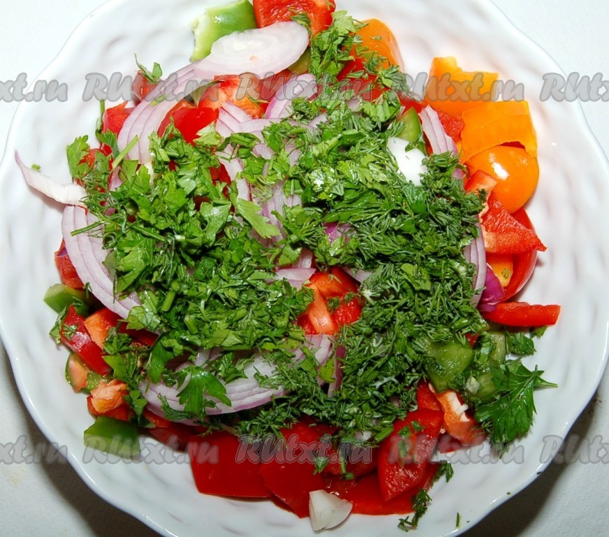 Зелень мелко нарезать и выложить поверх салата. Посолить, поперчить, добавить оливковое масло, перемешать.