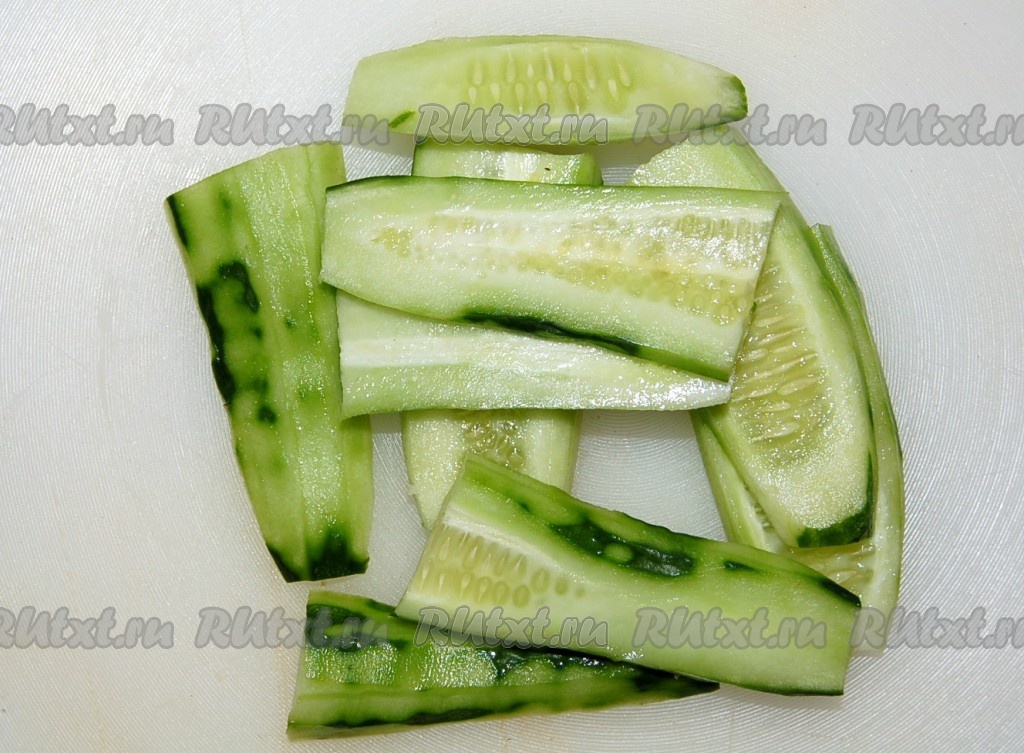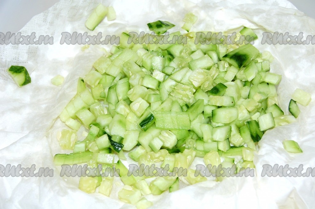 Отжать огурцы через салфетку от лишнего сока. Отжатые огурцы будут в соусе хрустящими, в отличие от неотжатых.