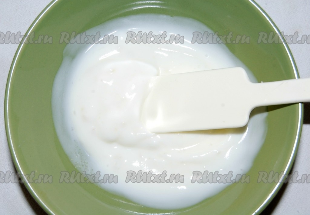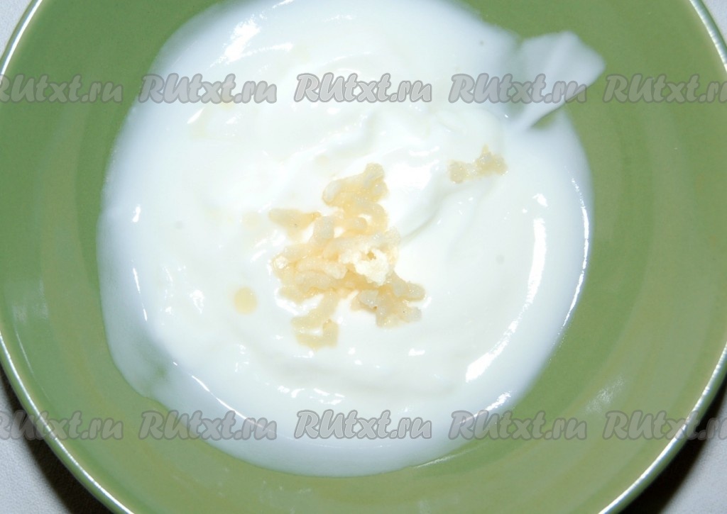 Вылить йогурт в миску, добавить очищенный и пропущенный через пресс чеснок.