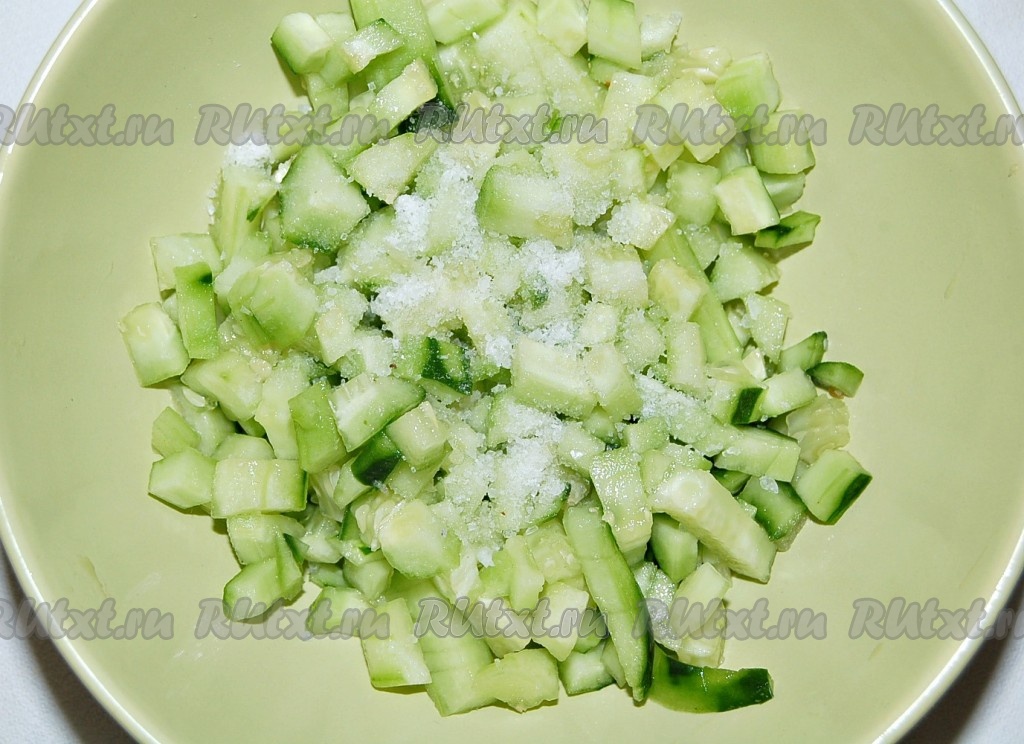 Нарезать огурцы на мелкие кубики, посолить, перемешать и оставить минут на 15, чтобы огурцы дали сок.