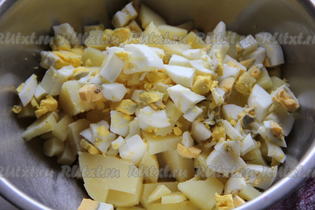 Яйца отварить и измельчить, добавить к картофелю.