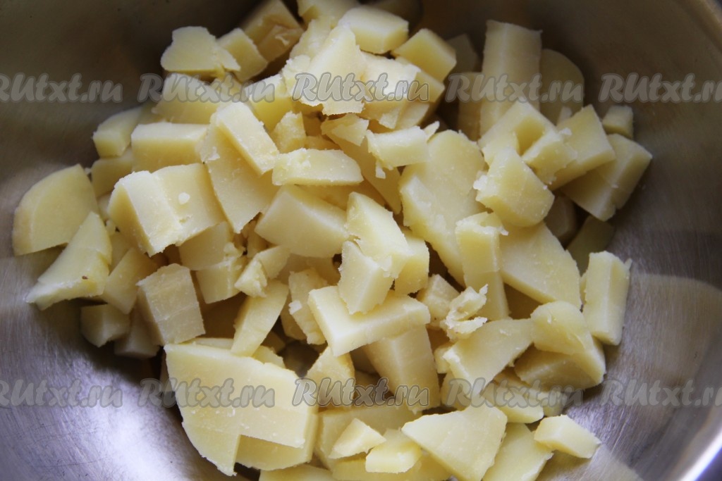Картофель отварить и нарезать кубиками.