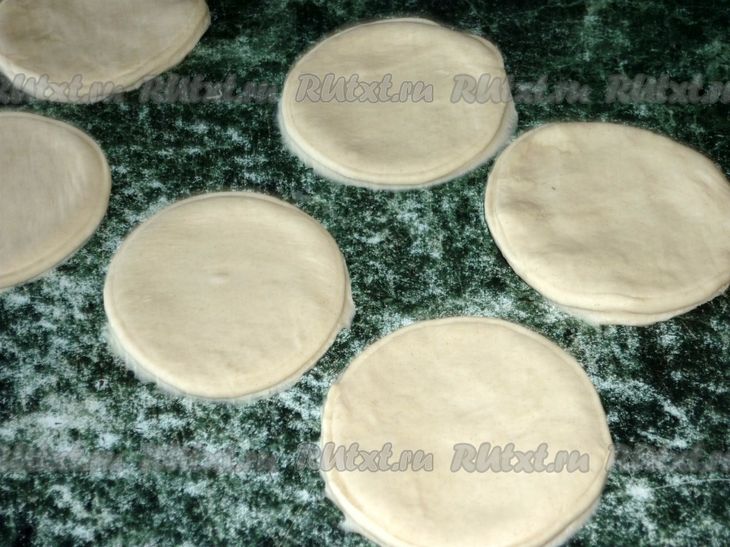 На припылённой мукой поверхности раскатать тесто тонко и вырезать подходящей чашкой кружки, если толщина теста позволяет, то можно кружки ещё слегка раскатать.