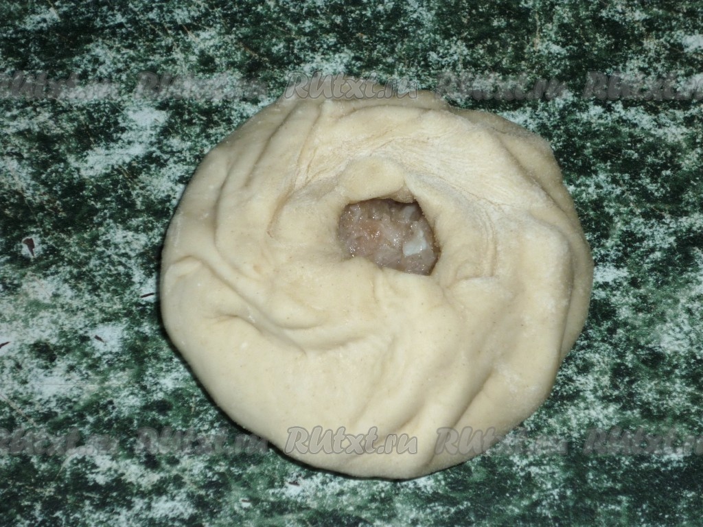 Защипывать тесто, одной рукой придерживая полуфабрикат, постоянно поворачивая его по кругу, второй рукой делая защипы на теста, при этом оставляя дырочку по центру (как на фото).