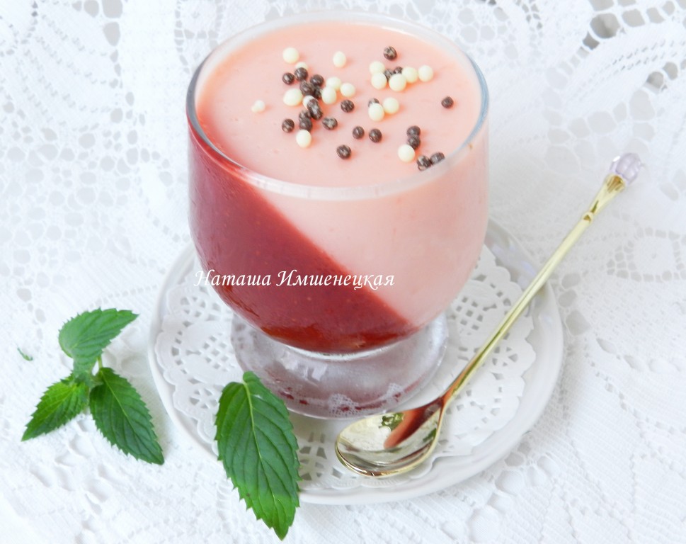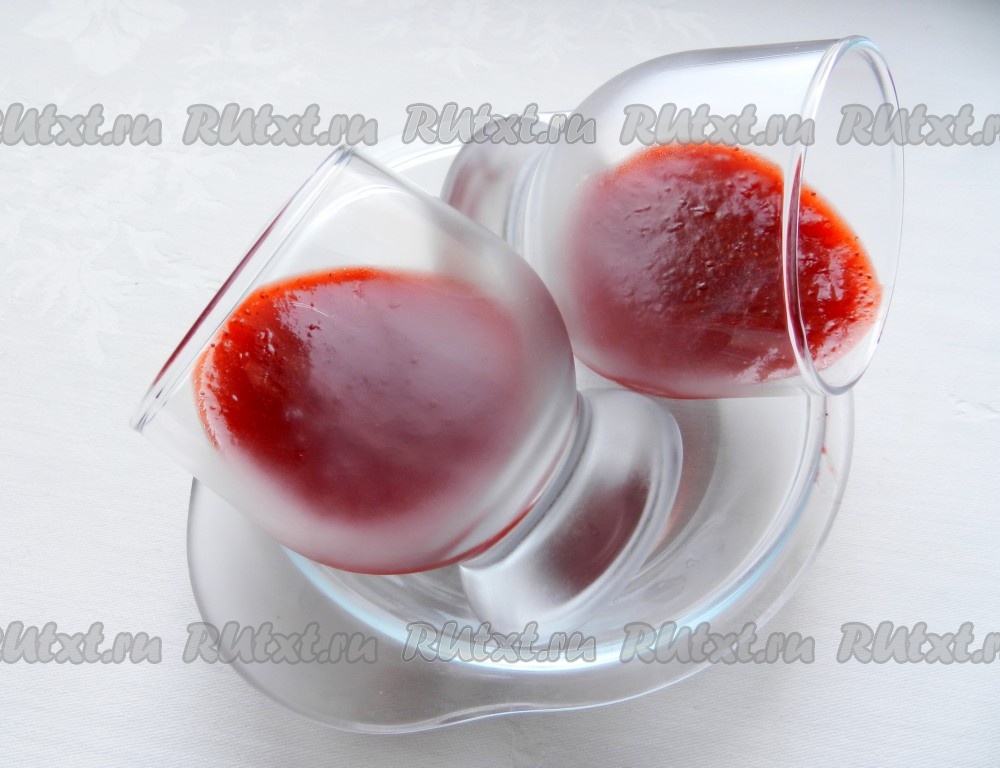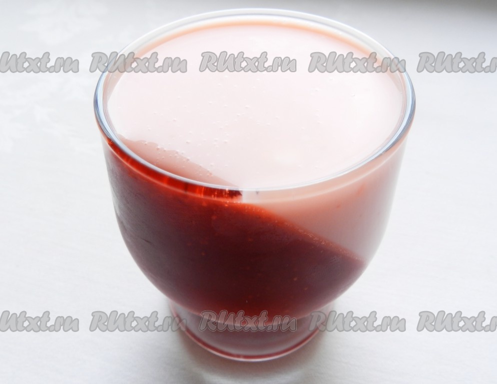 Аккуратно заполнить стаканы горячим клубничным желе и убрать в холодильник до полного застывания. Если желе полностью не застынет, при дальнейшем приготовлении десерта оно попросту сползёт на дно, и красивого эффекта не получится.