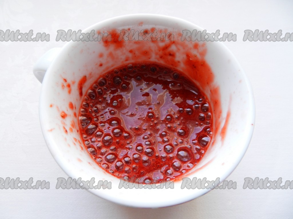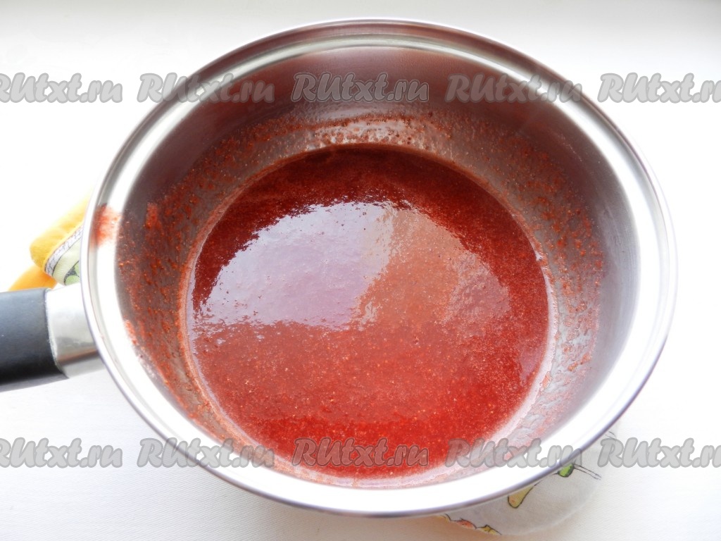 Клубничное пюре переложить в небольшую кастрюлю с толстым дном, поставить на огонь, довести до кипения, убрать с огня, всыпать половину порошка желе из пакетика, размешать, чтобы смесь стала однородной, слегка остудить.