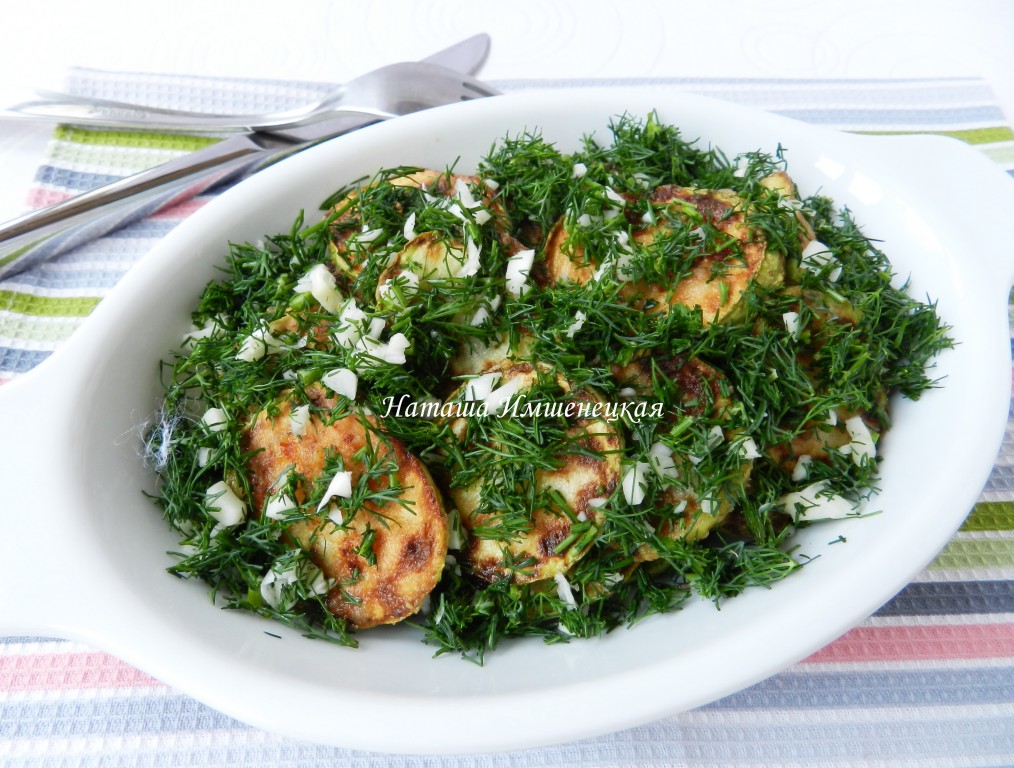 Посыпать кабачки укропом и чесноком и можно подавать. Аппетитные жареные кабачки с чесноком готовы.