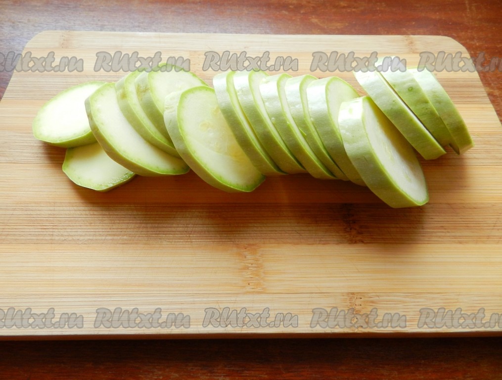Если кабачки молодые, то их не надо очищать от кожуры и семечек. Кабачки нарезать кружочками толщиной 3-5 мм.