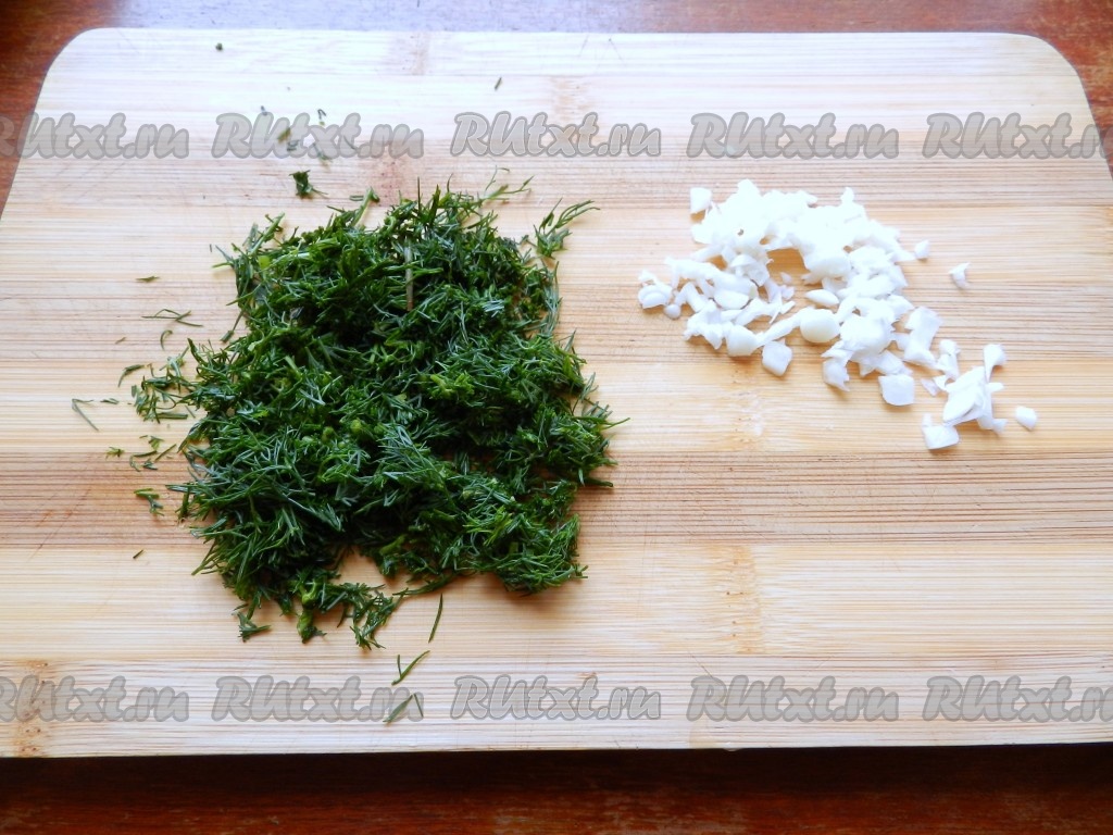 Чеснок очистить и мелко порубить ножом. Укроп вымыть и тоже порубить мелко.