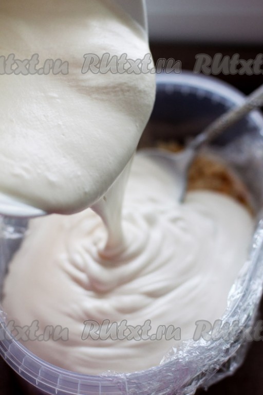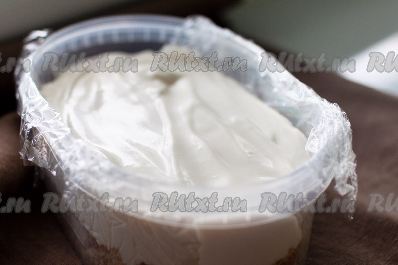 Накройте форму пищевой пленкой, не задевая десерт. Уберите в морозильную камеру на несколько часов, лучше на ночь.