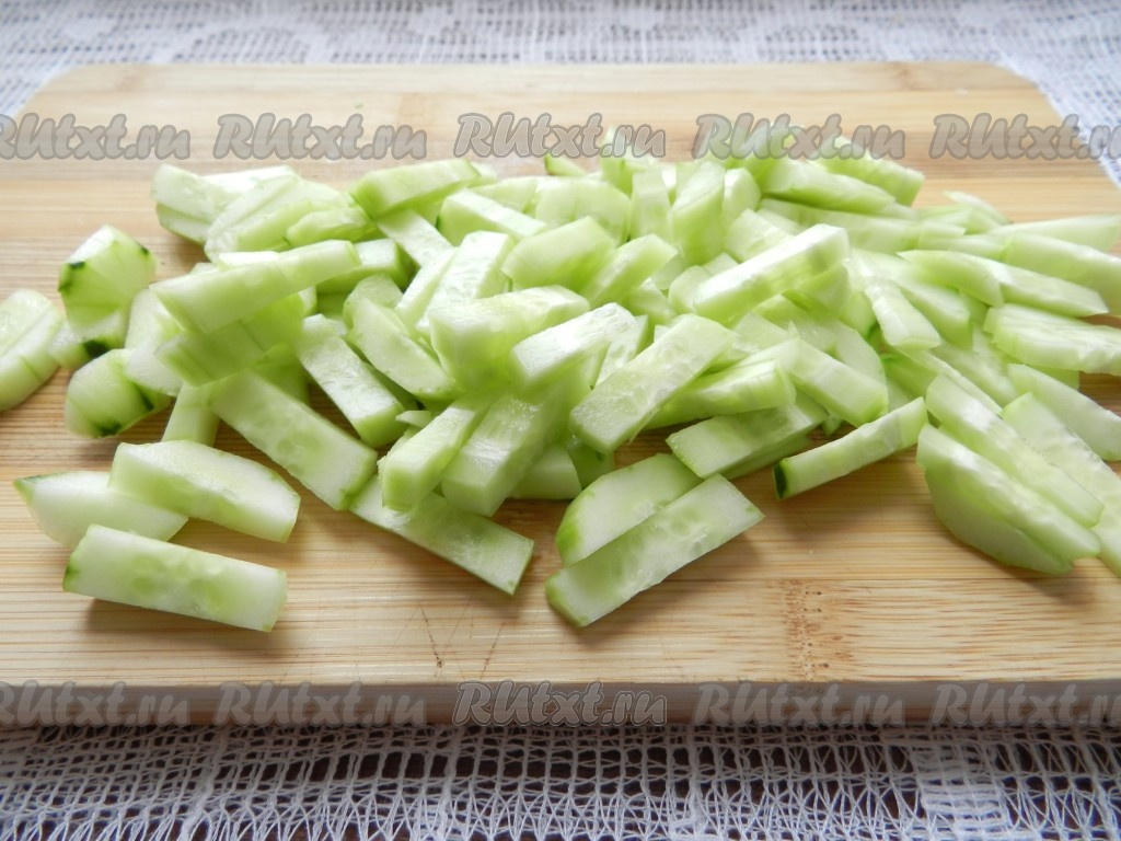 Вымытые свежие огурцы, по желанию, очистить от кожуры, а затем нарезать на небольшие брусочки.