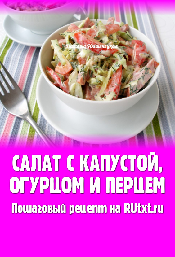 Заправить салат сметаной (или майонезом) непосредственно перед подачей. Вкусный, сочный, яркий, сытный салат, приготовленный с капустой, огурцом и болгарским перцем, в одном салатнике или порционно подать к столу.