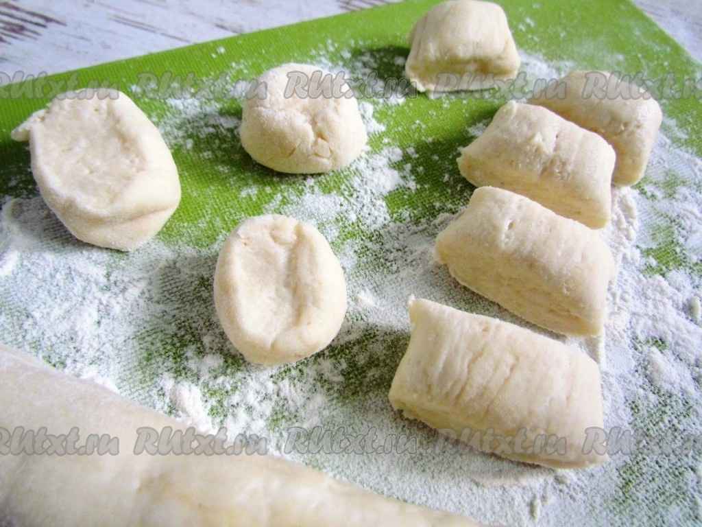 Стол присыпьте мукой. Из теста сформируйте длинную колбаску. Нарежьте её на маленькие кусочки, сформировав из каждого кусочка шарик.