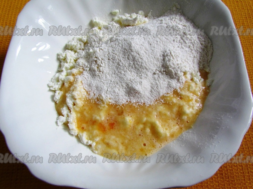 Соедините творог с яичной смесью, перемешайте яично-творожную массу.