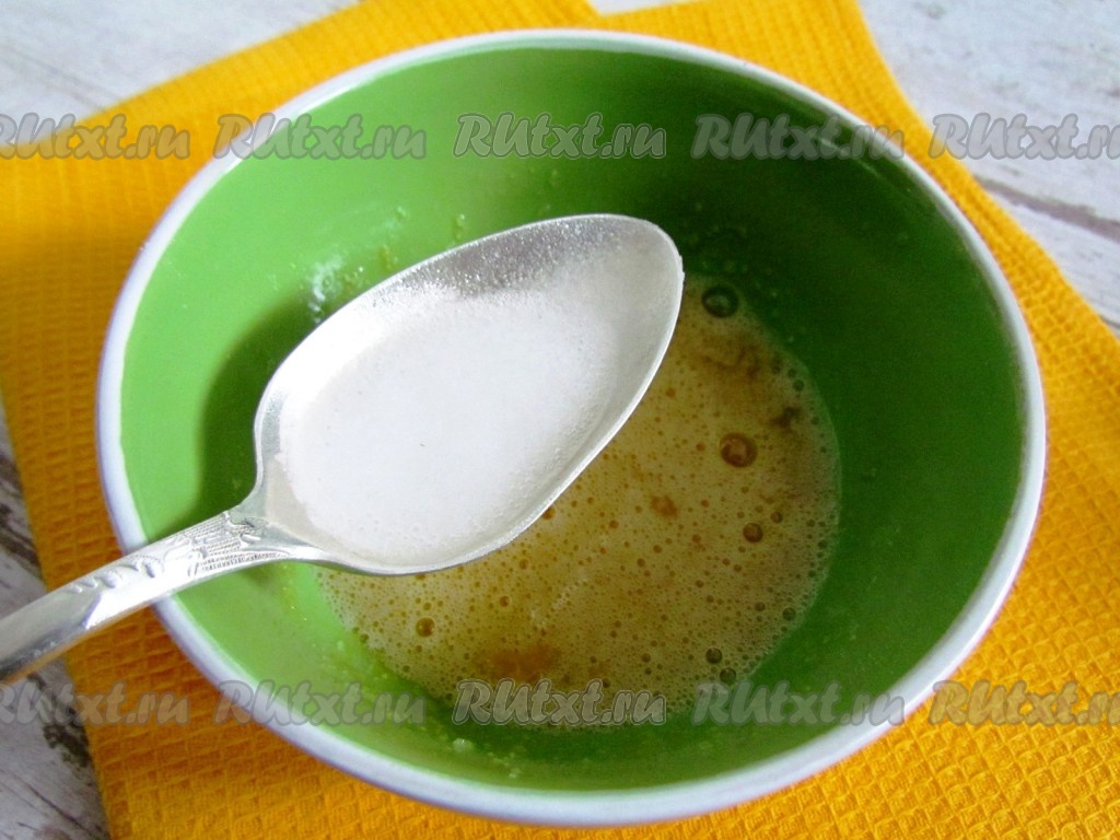 Соду погасите уксусом (или лимонным соком). Добавьте ко взбитому яйцу, перемешайте яичную смесь.
