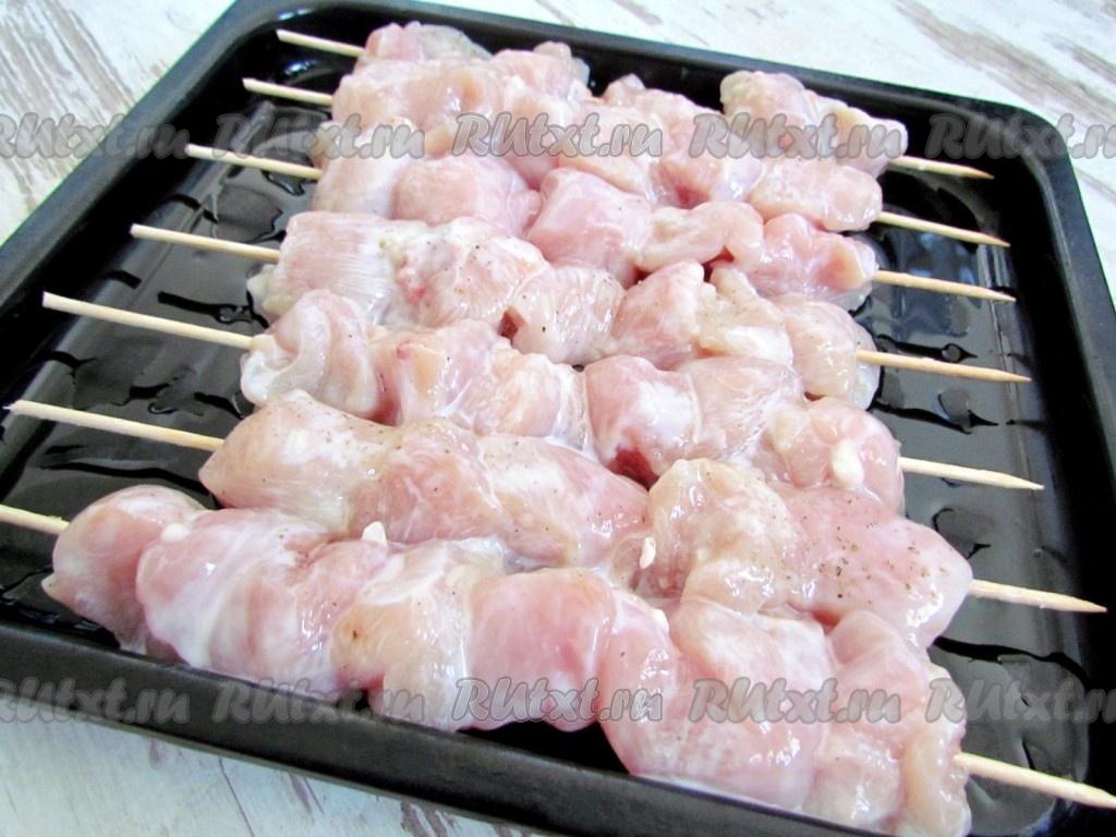 Противень смажьте растительным маслом, выложите шпажки с мясом. Духовку разогрейте до 200 градусов. Запекайте куриные шашлычки в духовке около 30 минут при температуре 200 градусов. Соком, который будет выделяться в процессе запекания, периодически поливайте шашлык, чтобы мясо не было сухим.