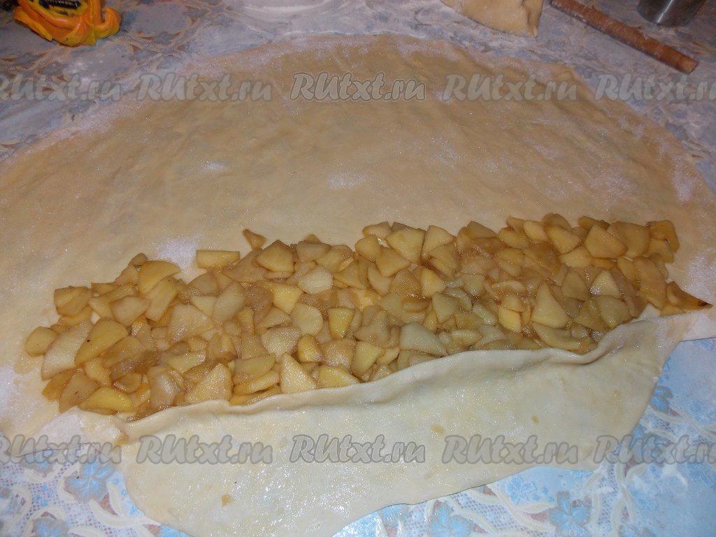 Тесто смазать чуть-чуть растопленным сливочным маслом и медом, затем выложить на него обжаренные яблоки и завернуть в рулет.