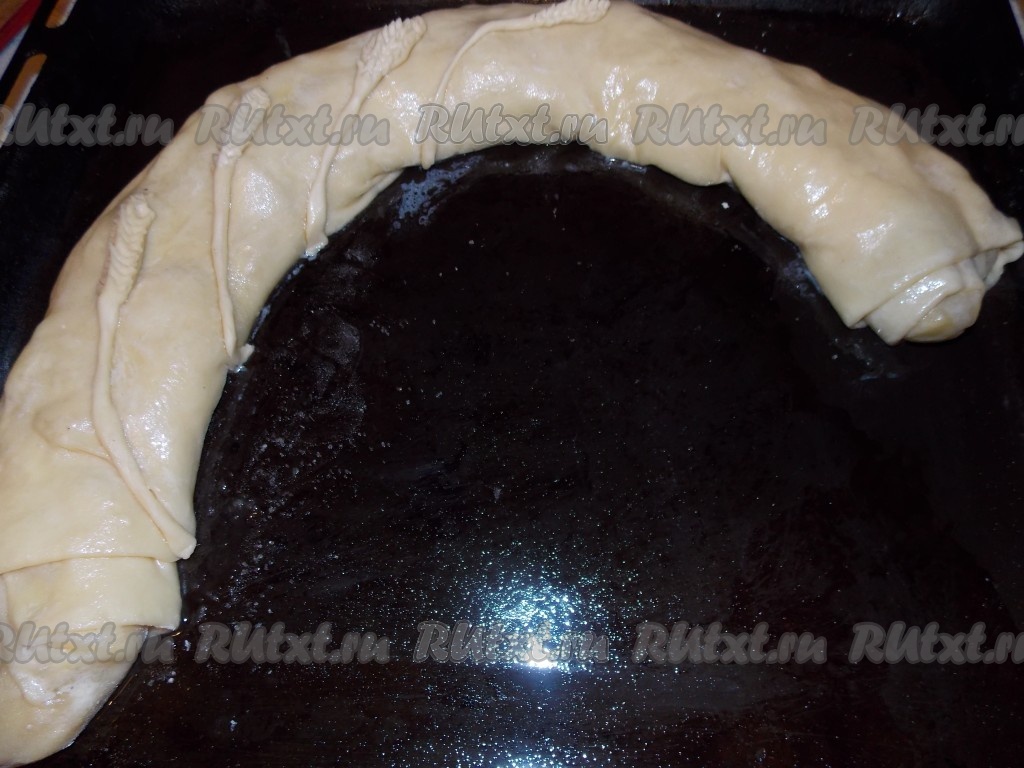 Вот такой у меня получился рулетик, почти полный противень. Я украсила его немного колосками из теста.