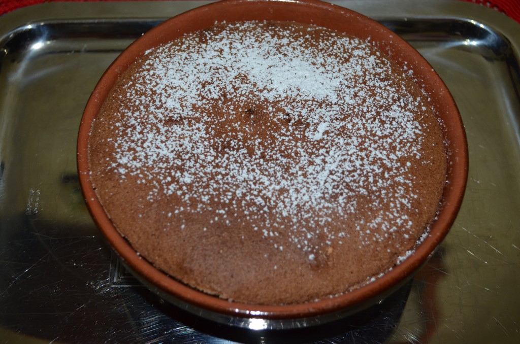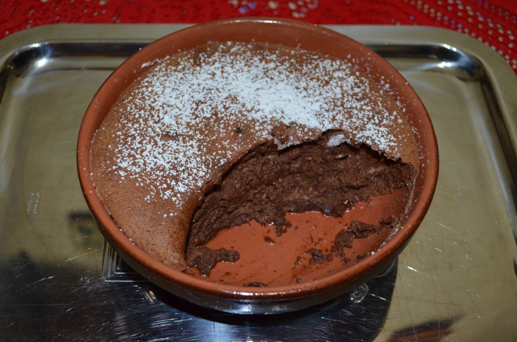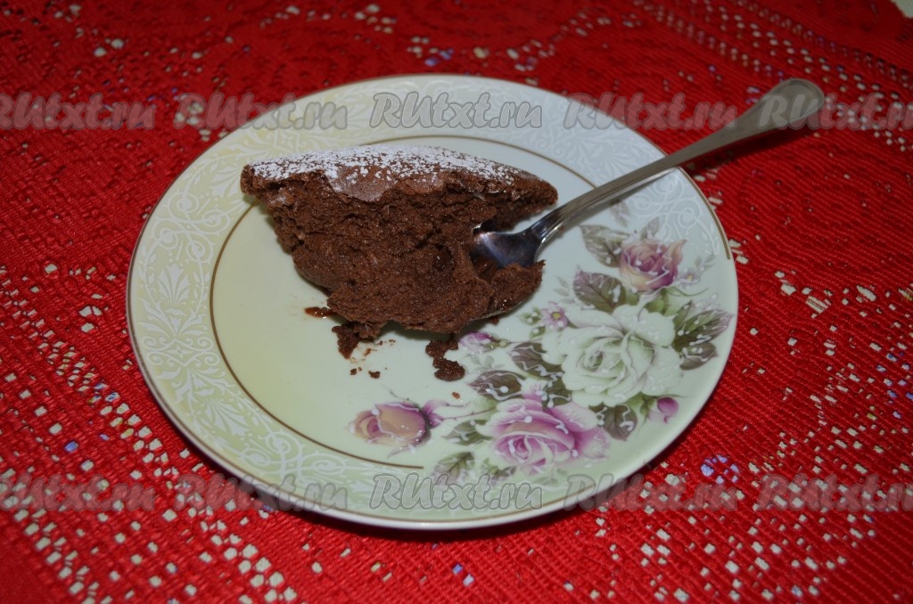 Готовое шоколадное суфле имеет корочку и немножко колышется. Посыпаем сахарной пудрой и сразу же (в горячем виде) подаём к столу. Десерт получается изумительно вкусным, нежнейшим, просто тающим во рту!