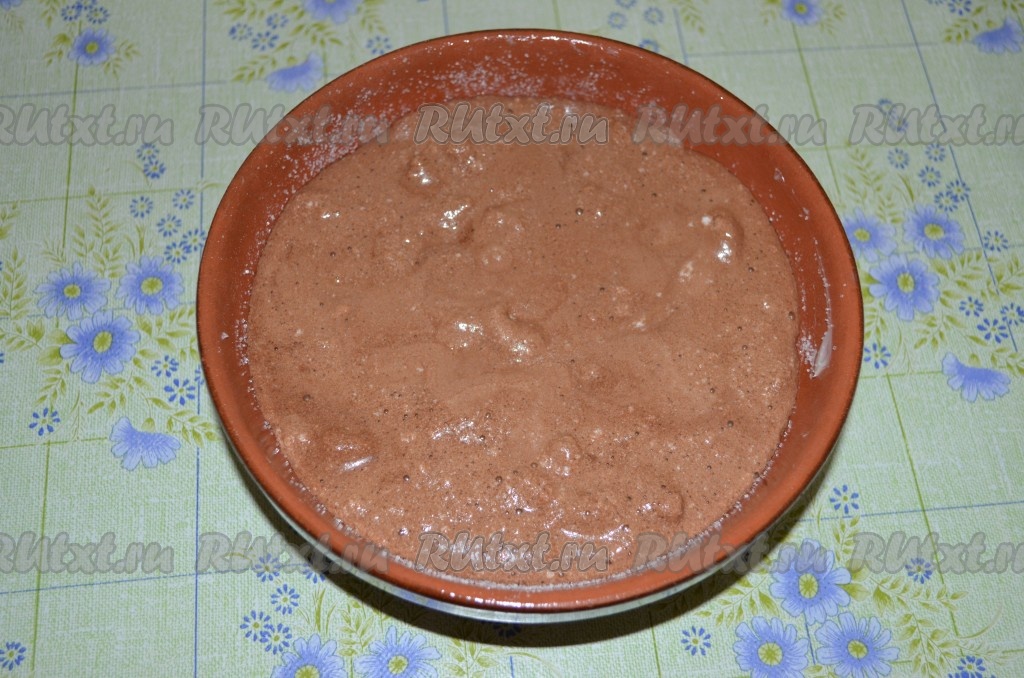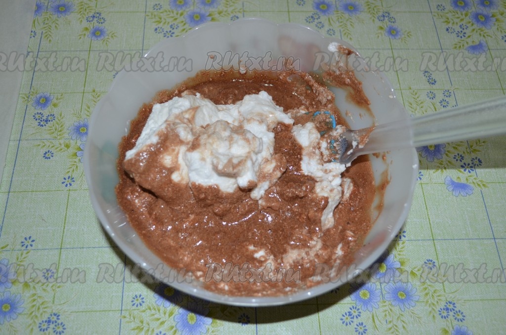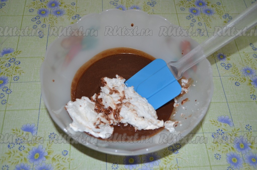 Смешиваем, постепенно добавляя, белки с шоколадной массой, аккуратно перемешивая лопаткой снизу вверх.