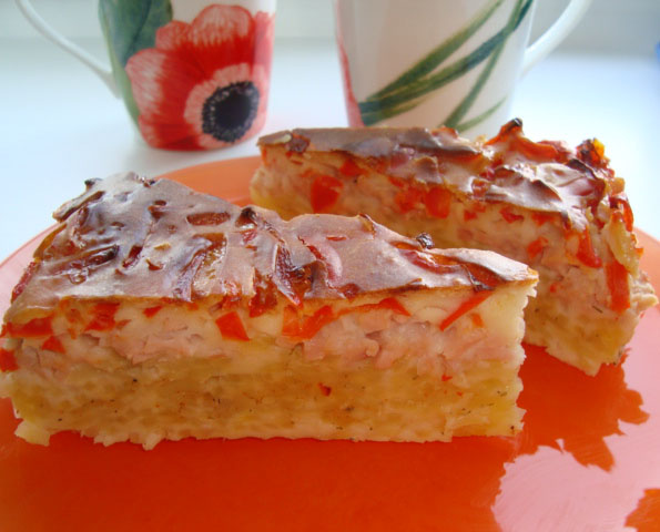 Меня заинтересовало блинное тесто, решила сегодня приготовить, вот что получилось. Вкусно!!! Особенно пирог хорош после того, как постоит какое-то время, все вкусы объединяются.